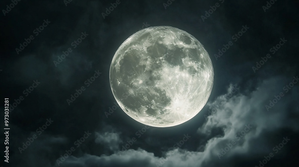 The watermark will not be included on Wall mural.: Full moon shining on cloudy night sky background -