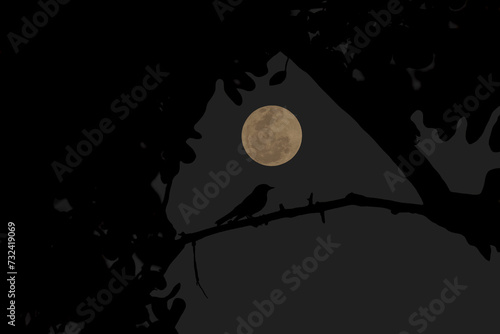 The watermark will not be included on Wall mural.: Full moon with bird silhouette on tree branch at night -