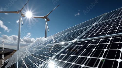 The watermark will not be included on Wall mural.: Full-scale solar panel array in green field under clear sky