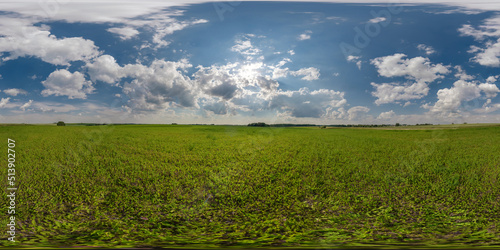 Wall mural full seamless 360 hdri panorama view among farming fields with sun and clouds in overcast sky in equ