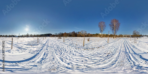 Wall mural full seamless spherical panorama 360 by 180 degrees angle view on the snow covered field in sunny wi