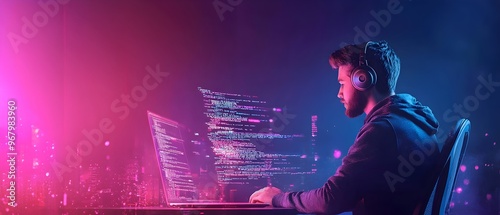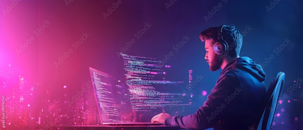 The watermark will not be included on Wall mural.: Full stack developer working on cloud and coding in the background for a modern software development