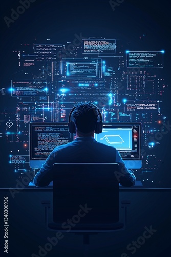 Wall mural full-stack developer working on cloud integration, coding in the background, modern software develop - Wall murals Wall mural full-stack developer working on cloud integration, coding in the background, modern software develop - Wall murals