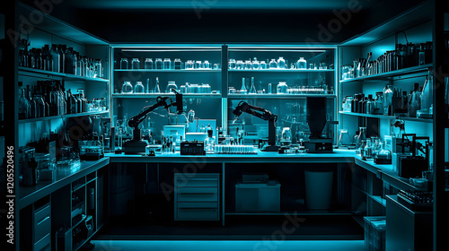 Wall mural fully equipped modern science laboratory with glowing blue lights and an array of advanced technolog - Wall murals Wall mural fully equipped modern science laboratory with glowing blue lights and an array of advanced technolog - Wall murals