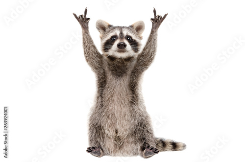 Wall mural funny raccoon showing a rock gesture isolated on white background