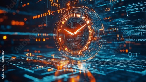 The watermark will not be included on Wall mural.: Future-looking timepiece visage with digital data all around it is counting down -