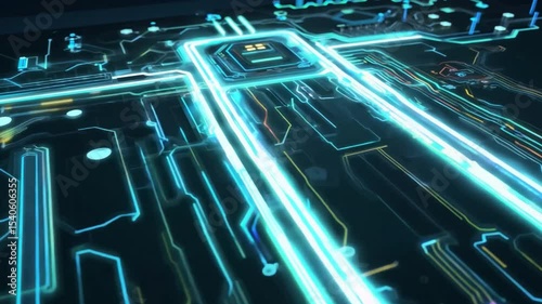 The watermark will not be included on Wall mural.: Futuristic abstract circuit board design with glowing lines and nodes for technology and innovation