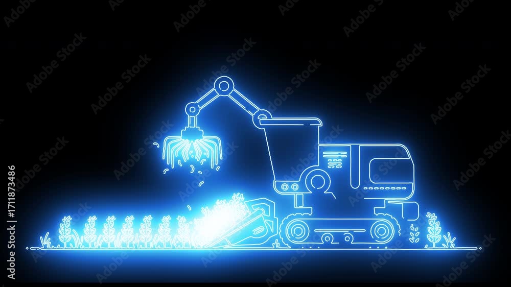 Wall mural futuristic agricultural automation concept showing a glowing neon blue autonomous combine harvester  - Wall murals Wall mural futuristic agricultural automation concept showing a glowing neon blue autonomous combine harvester - Wall murals