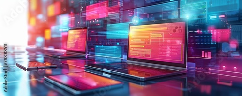 Wall mural futuristic array of responsive devices displaying vibrant interfaces for web design - Wall murals Wall mural futuristic array of responsive devices displaying vibrant interfaces for web design - Wall murals