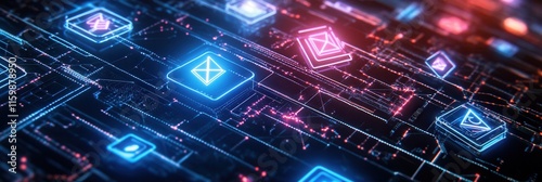 Wall mural : Futuristic blockchain network visualization, interconnected digital nodes representing cryptocurrenc