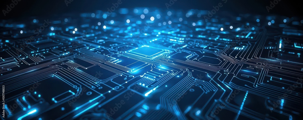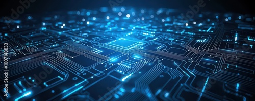 Wall mural : Futuristic blue circuit board background with glowing lines and digital patterns representing modern