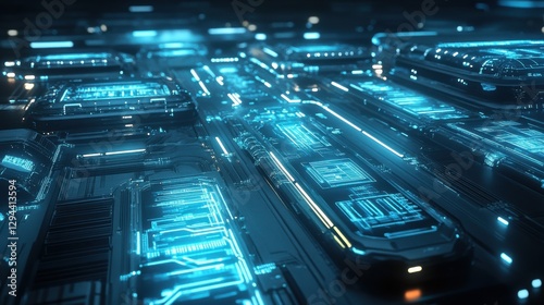 Wall mural futuristic blue circuit board design with glowing lines and patterns - Wall murals Wall mural futuristic blue circuit board design with glowing lines and patterns - Wall murals