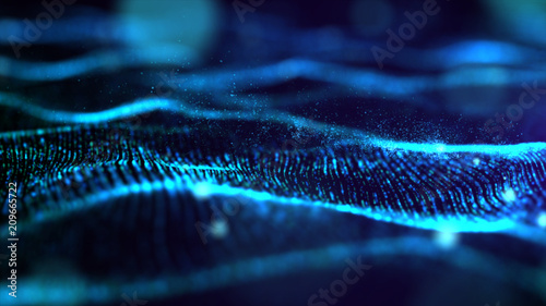 Wall mural : Futuristic blue digital abstract luxurious sparkling wave particles flow de-focus background