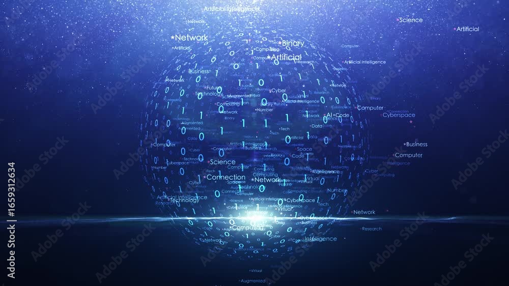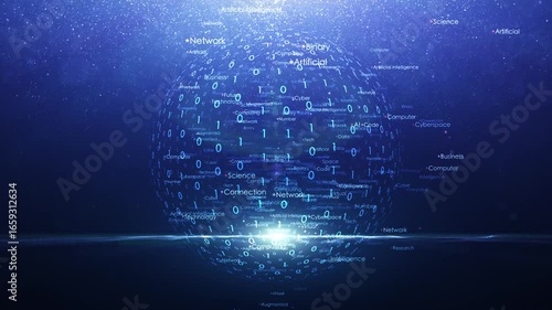 Wall mural : Futuristic blue shining background with technology word cloud and computer data sphere loop animatio