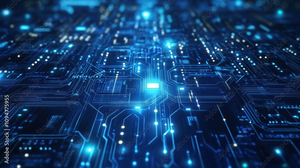 Wall mural : Futuristic circuit board background pulsating with blue energy and data flow