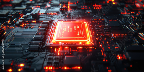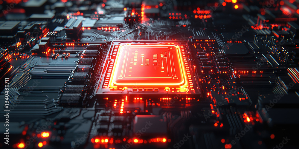 The watermark will not be included on Wall mural.: Futuristic circuit board with glowing red lights and intricate patterns, showcasing advanced technol