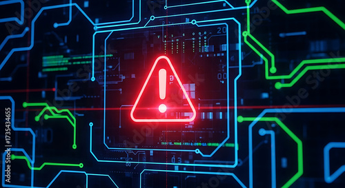 Wall mural : Futuristic circuitry with red warning symbol and data streams technology alert