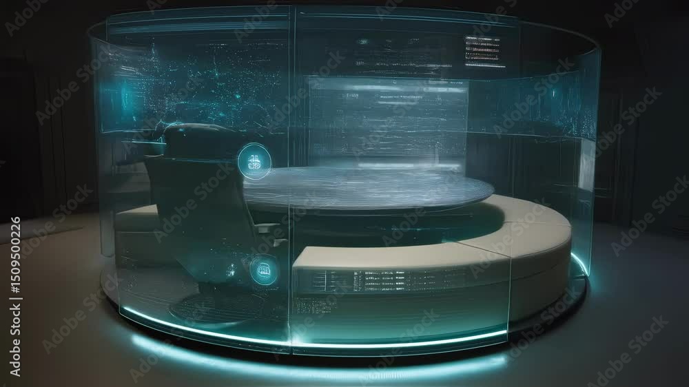 Wall mural : Futuristic circular glass command center with holographic display undergoing various transformations