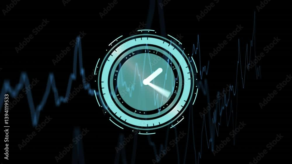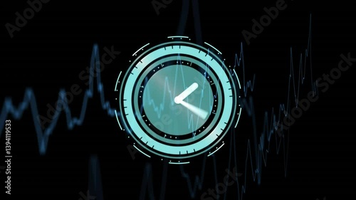 The watermark will not be included on Wall mural.: Futuristic clock animation over fluctuating line graph on dark background