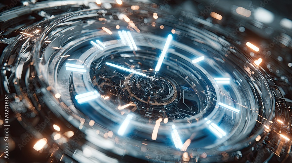 Wall mural : Futuristic clock face with glowing elements and abstract design