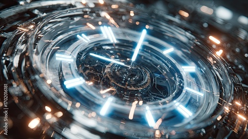 The watermark will not be included on Wall mural.: Futuristic clock face with glowing elements and abstract design