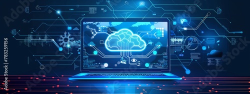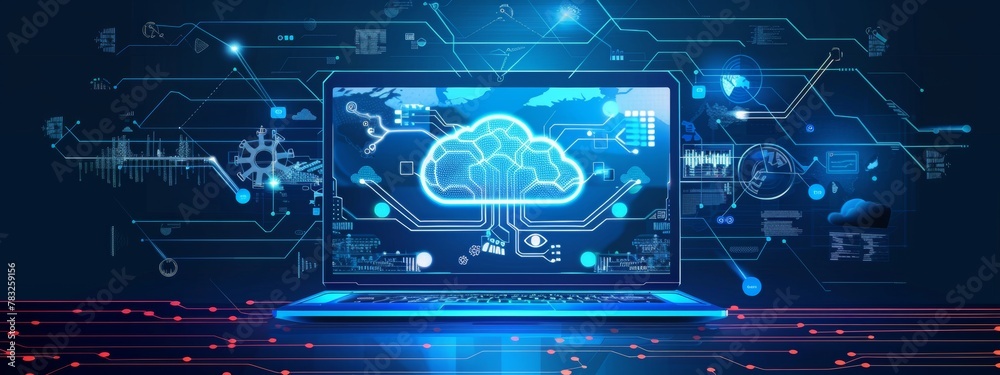 Wall mural futuristic cloud computing and network interface on laptop screen. a modern laptop displaying a dyna