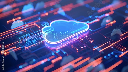 Wall mural : Futuristic cloud computing technology with neon lights and digital circuits on dark background