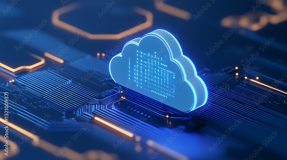 Wall mural : Futuristic cloud storage icon on circuit board with digital patterns and neon blue glow for technolo
