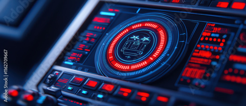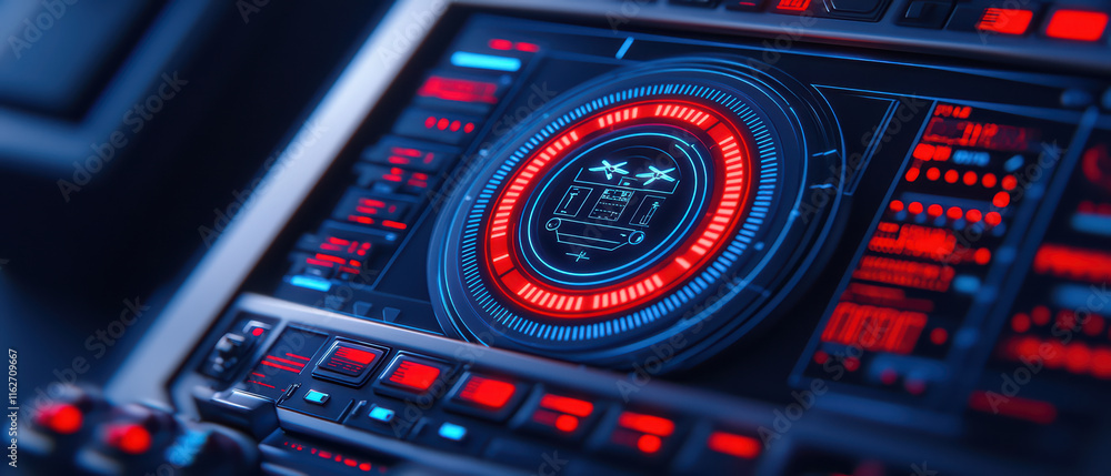 The watermark will not be included on Wall mural.: Futuristic control panel displaying drone interface with vibrant colors and intricate design
