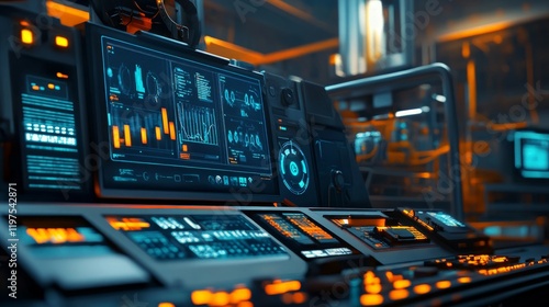 The watermark will not be included on Wall mural.: Futuristic control panel with advanced digital interfaces and displays