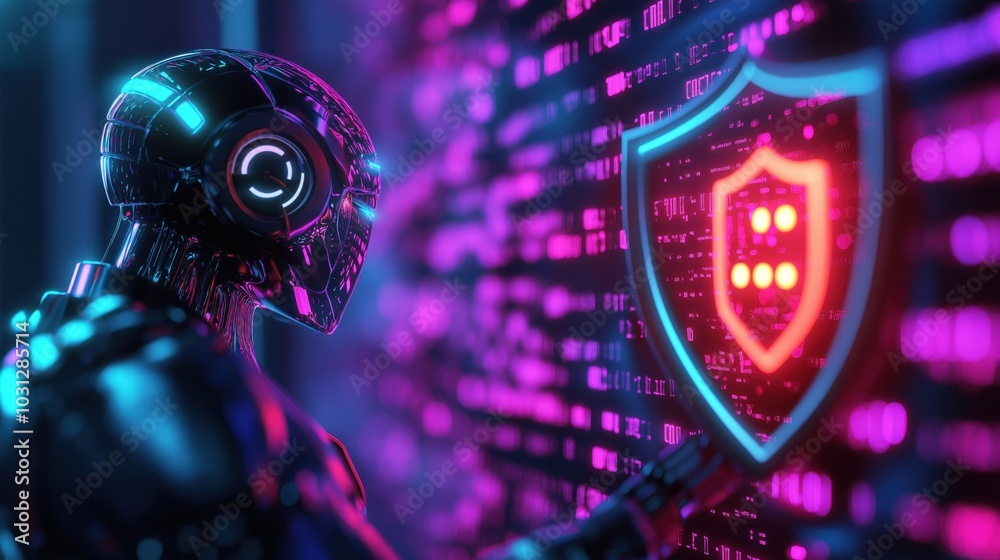 Wall mural : Futuristic cybersecurity concept with a glowing neon shield and circuit elements in a digital abstra