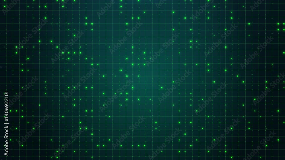 Wall mural : Futuristic green digital grid with blinking squares and plus symbols background loop