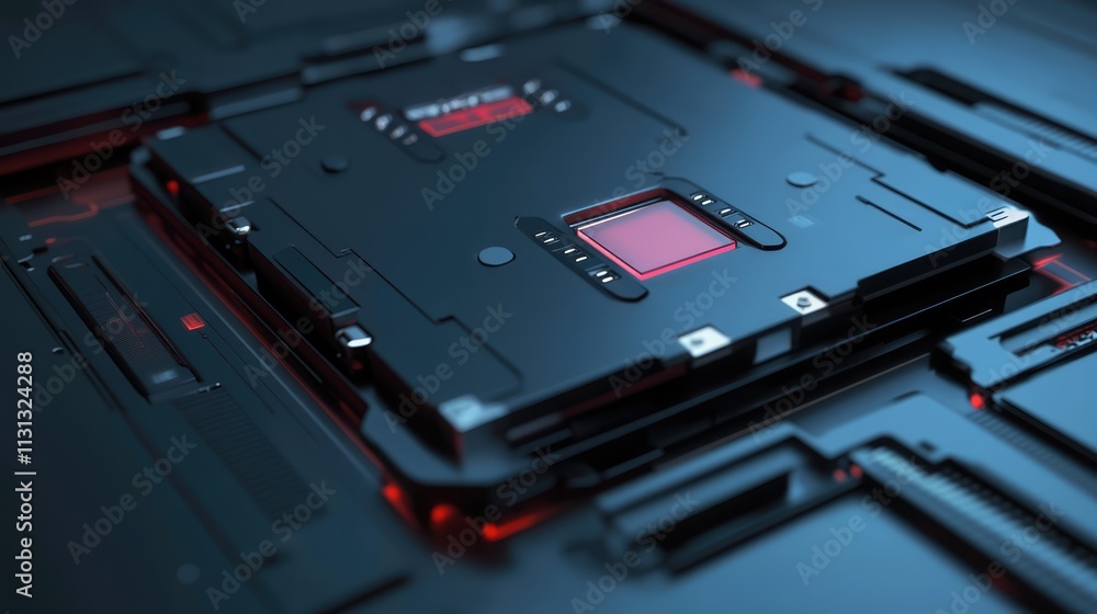 The watermark will not be included on Wall mural.: Futuristic data backup technology concept with high-tech circuitry and red accents