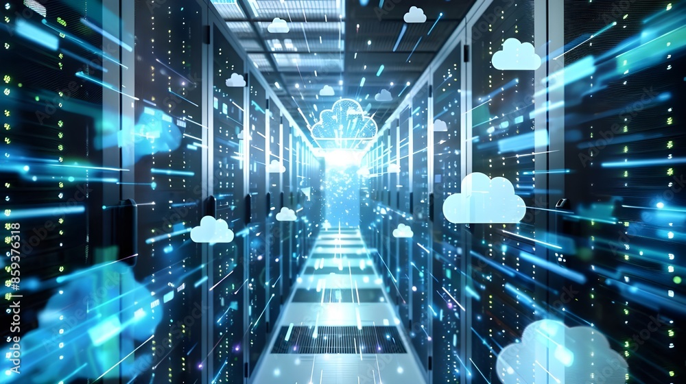 Wall mural futuristic data center server racks digital holographic cloud computing icons data storage, high-tec - Wall murals Wall mural futuristic data center server racks digital holographic cloud computing icons data storage, high-tec - Wall murals