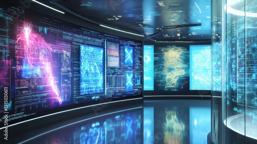 The watermark will not be included on Wall mural.: Futuristic data center with glowing screens displaying complex information