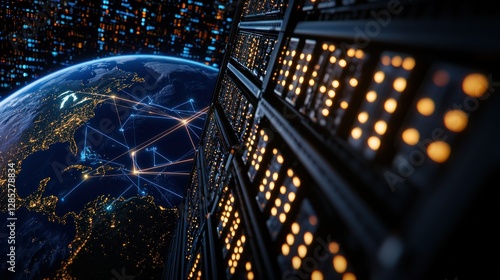 The watermark will not be included on Wall mural.: Futuristic data center with illuminated servers showcasing global connectivity over earth