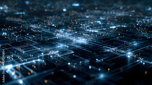 Wall mural futuristic data network grid with glowing nodes and circuits in a blue digital top view - Wall murals Wall mural futuristic data network grid with glowing nodes and circuits in a blue digital top view - Wall murals