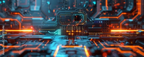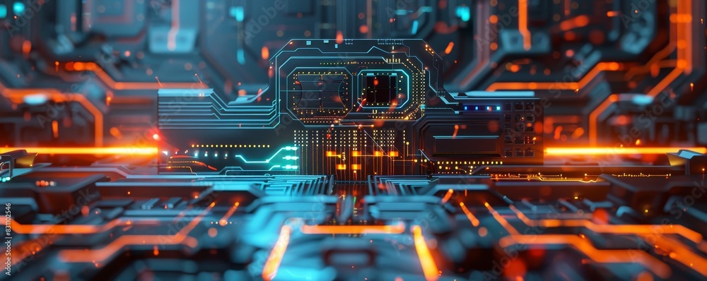 Wall mural : Futuristic digital circuit board with glowing lines and complex patterns, representing advanced tech