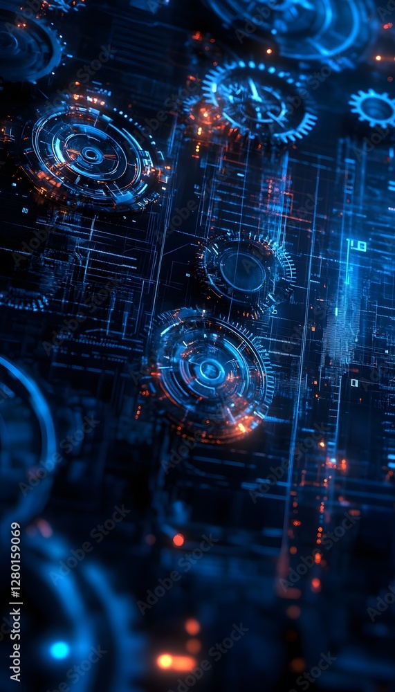 Wall mural : Futuristic digital circuits and cogs depict technological advancement and progress