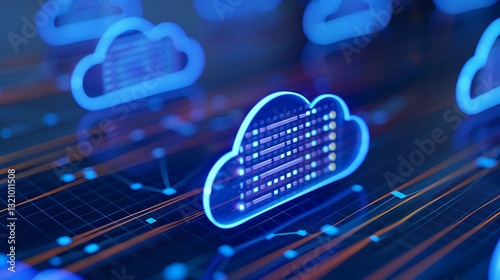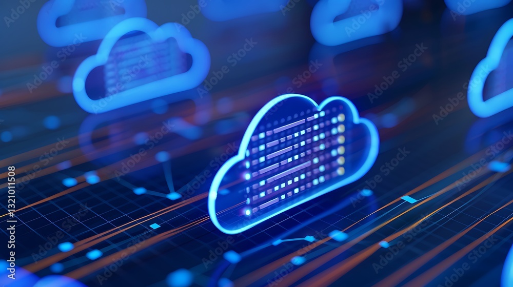 Wall mural : Futuristic digital cloud technology concept with glowing cloud icons and data visualization elements
