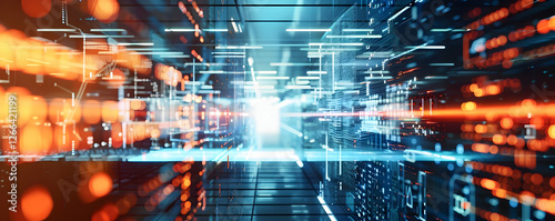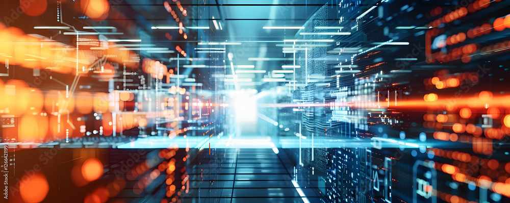 Wall mural futuristic digital corridor with glowing lights and data streams in motion