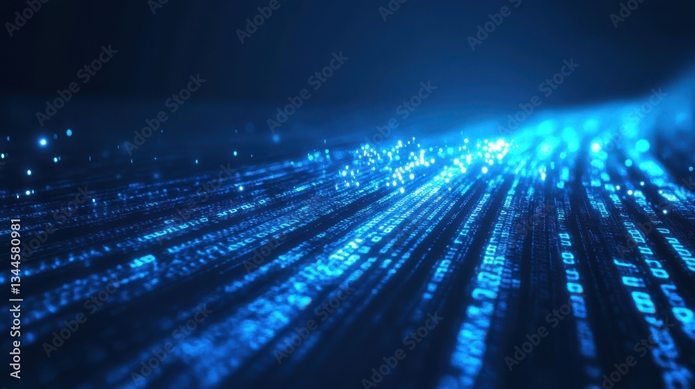 Wall mural : Futuristic digital data stream, glowing binary code flowing in a dark blue space, high-tech cyber ba