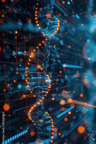 Futuristic digital dna strand with glowing particles and data connections in a high-tech environmentWall mural