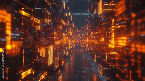 The watermark will not be included on Wall mural.: Futuristic digital environment with glowing orange lines and abstract structures in motion