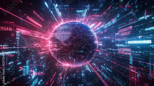 The watermark will not be included on Wall mural.: Futuristic digital globe with glowing data streams -