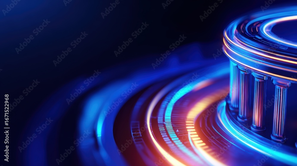 The watermark will not be included on Wall mural.: Futuristic digital interface with glowing circular patterns and architectural elements in a dark set