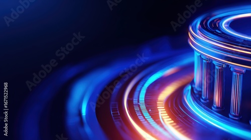 Wall mural : Futuristic digital interface with glowing circular patterns and architectural elements in a dark set