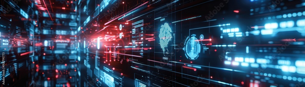 The watermark will not be included on Wall mural.: Futuristic digital interface with neon lights and data streams creating a high-tech environment, per
