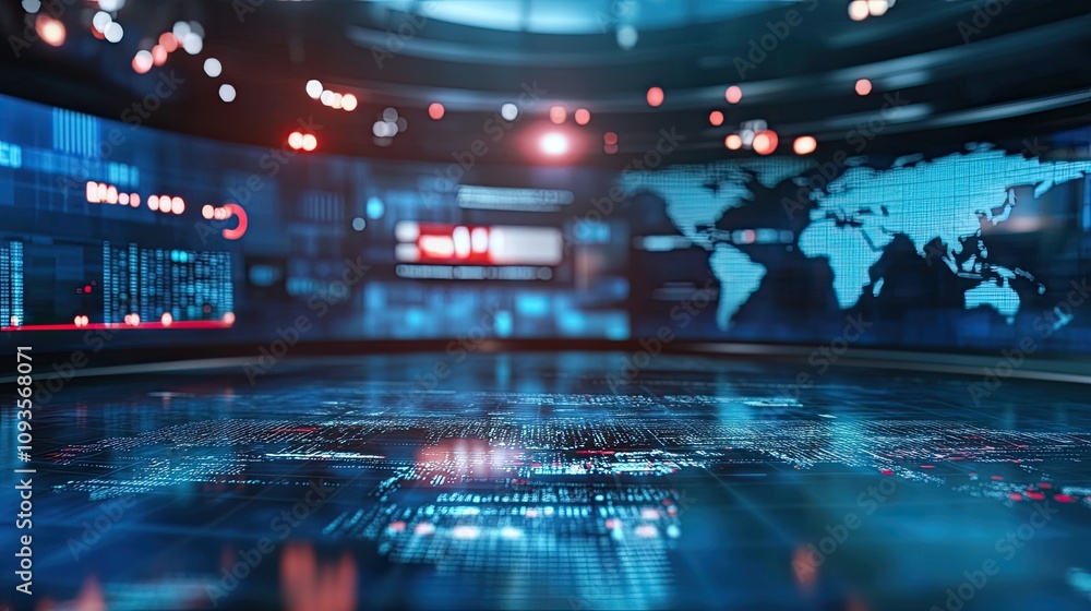 Wall mural futuristic digital interface with world map and data. - Wall murals Wall mural futuristic digital interface with world map and data. - Wall murals
