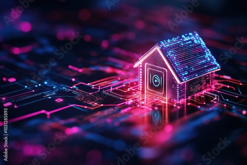 Wall mural : Futuristic digital landscape with neon lit smart home architecture illustrating the concept of advan